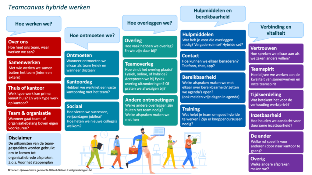 Een waardevol hulpmiddel bij stap 2 (en deels ook bij stap 3) is het Teamcanvas Hybride Werken. Het helpt teams om gestructureerd in gesprek te gaan over de manier van samenwerken, en daarover concrete afspraken te maken.