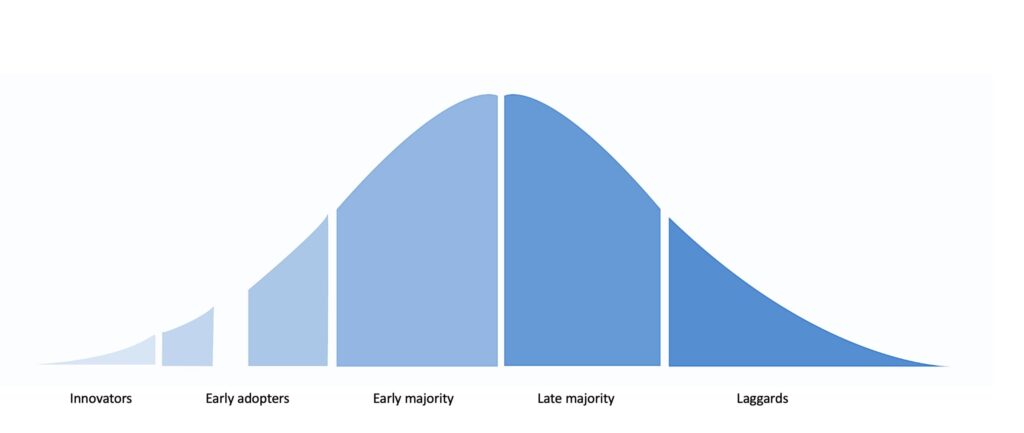 Een verandering is pas succesvol als ook de early en late majority en uiteindelijk ook de laggards de vernieuwing omarmen. Waar we op moeten letten is dat de ‘early adopters’ anders denken en werken dan de ‘majority’. De woorden ‘nieuw’, ‘innovatief’ en ‘experimenteel’ schrikken hen af. Dit is geen kwestie van onwil of onkunde, maar meer de houding ‘de kat uit de boom kijken’. Zeker bij de twijfelaars uit de late majority is dat het geval. Ze weten dat de vernieuwing er is en wat het je brengen kan, maar hebben geen zin in gedoe en extra handelingen.